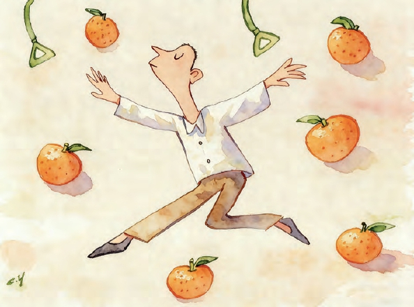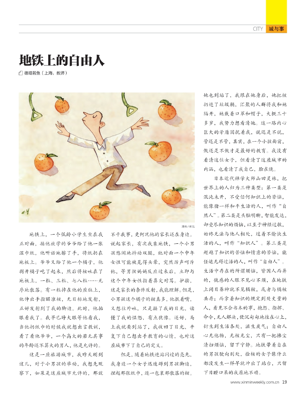 日本近代禅学大师山田灵林,把世界上的人归为三种类型:第一类是混沌未开,不受任何知识上的苦恼,能像猪一样和平生活的人,叫作“自然人”。第二类是头脑明晰,智能发达,却受尽知识的烦恼,以至于神经过敏,始终无法与他人相处,过着不愉快生活的人,叫作“知识人”。第三类是超越了知识的苦恼和情意的苦恼,能任运无碍过活的人,叫作“自由人”。生活中存在的所谓烦恼,皆因人而异的,钝感的人眼不见心不烦,在地铁上闭目养神就不见橘核,或者与橘核共存;而拿着知识的规定到处丈量的人,看见不合书本的事,抱怨、指挥、命令,无人解决,便沉甸甸地挂在心上,衍生到生活各处,滋生戾气;自由人心无他物,无核无尘,只有一把拂尘清扫烦恼,留下宁静。地铁带着自在的男孩驶向别处,捡核的女子像什么都没发生一样早就冲出了站台,只留下目瞪口呆的我原地不动。