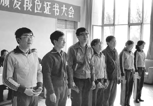 1982年3月17日,中国第一次向围棋运动员正式颁发段位证书。国家体委向首批获得围棋高段位的10名运动员颁发了证书。新华社所发这张照片中,左一为获得九段证书的聂卫平,右二为获得六段证书的孔祥明。