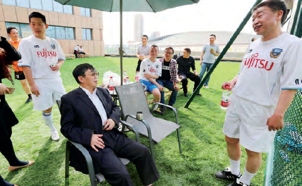 聂卫平在笼式足球场观看围棋弟子踢球,并在中场休息时指导常昊(左)、古力(右)等踢球。 摄影/周国强