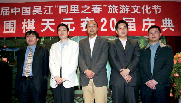2006年,在第20届中国围棋天元赛庆典上,当时的历届天元(左起):聂卫平、马晓春、刘小光、常昊、黄奕中。摄影/周国强