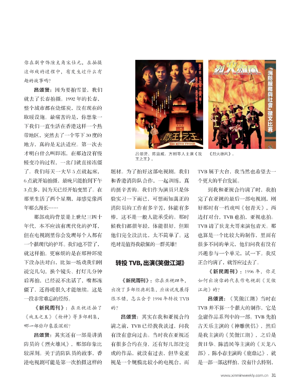 吕颂贤:其实还有一部是讲消防员的《烈火雄风》,那部印象比较深刻。关于消防队员的故事,香港电视剧可能是第一次拍摄这样的题材。为了拍好这部电视剧,我们和香港消防队合作,一起训练,真的挺辛苦的。我们作为演员只是体验实习一下而已,可想而知真正的消防员的工作有多辛苦,体能有多棒,这不是一般人能承受的。那时候我们都很年轻,体能很好,但跟他们完全没法比,太不简单了。这绝对是值得我敬佩的一群英雄!