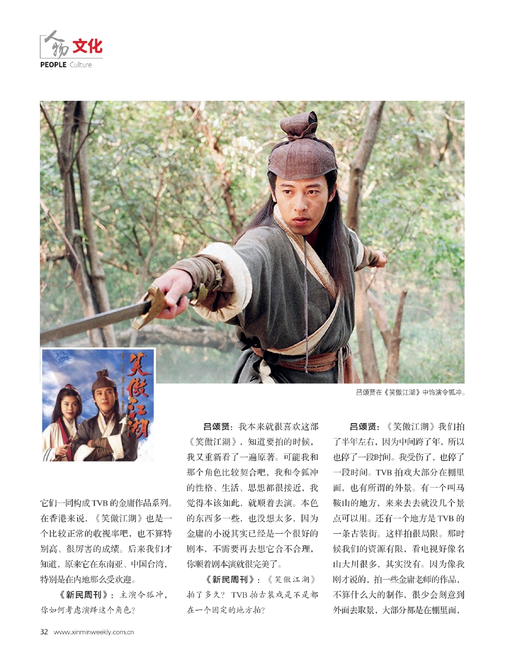 吕颂贤:我本来就很喜欢这部《笑傲江湖》,知道要拍的时候,我又重新看了一遍原著。可能我和那个角色比较契合吧,我和令狐冲的性格、生活、思想都很接近,我觉得本该如此,就顺着去演。本色的东西多一些,也没想太多,因为金庸的小说其实已经是一个很好的剧本,不需要再去想它合不合理,你顺着剧本演就很完美了。