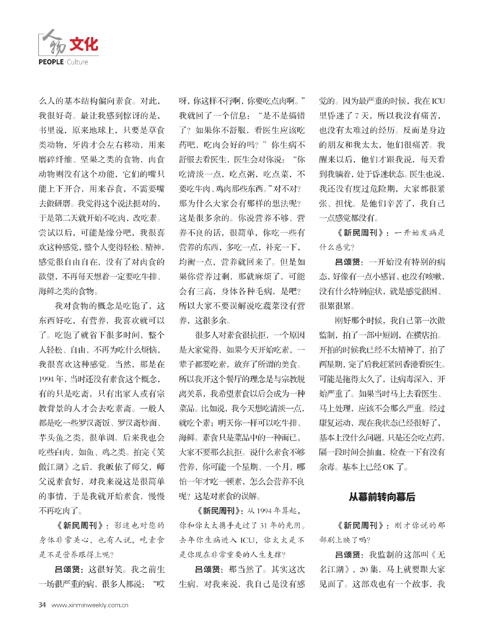 近半年来,吕颂贤一直在休养,深居简出。近日,从香港回到上海的吕颂贤在他自己开办的素菜馆焱格格·临湖里接受了《新民周刊》记者的独家专访,畅谈他从影至今的人生历程。从考入香港演艺学院的懵懂少年,到在亚视崭露头角,因TVB《笑傲江湖》走红大江南北,再到重病一场……病愈归来,经历生死劫,回首影视路,吕颂贤依旧是吕颂贤,一个在荧屏上叱咤风云的大侠,一个在荧屏下低调谦逊的人。