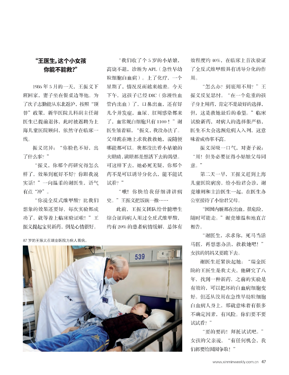 “怎么办?到底用不用?”王振义反复思忖。“在一个危重的孩子身上用药,肯定不是最好的选择,但,这是救她最后的希望。”临床试验新药,对病人的选择很严格,医生不太会选濒危病人入列,这意味着成功率不高。