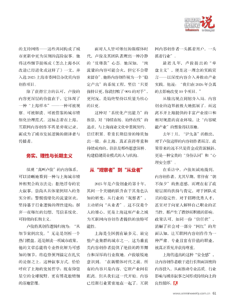 2025年是卢俊创业的第十年,其间一个关键的跃升在于其角色认知的转变:从行业的“观察者”,主动转向“从业者”。这不仅是个人的雄心,更是上海这座产业之城为互联网内容创作者提供的独特可能性。