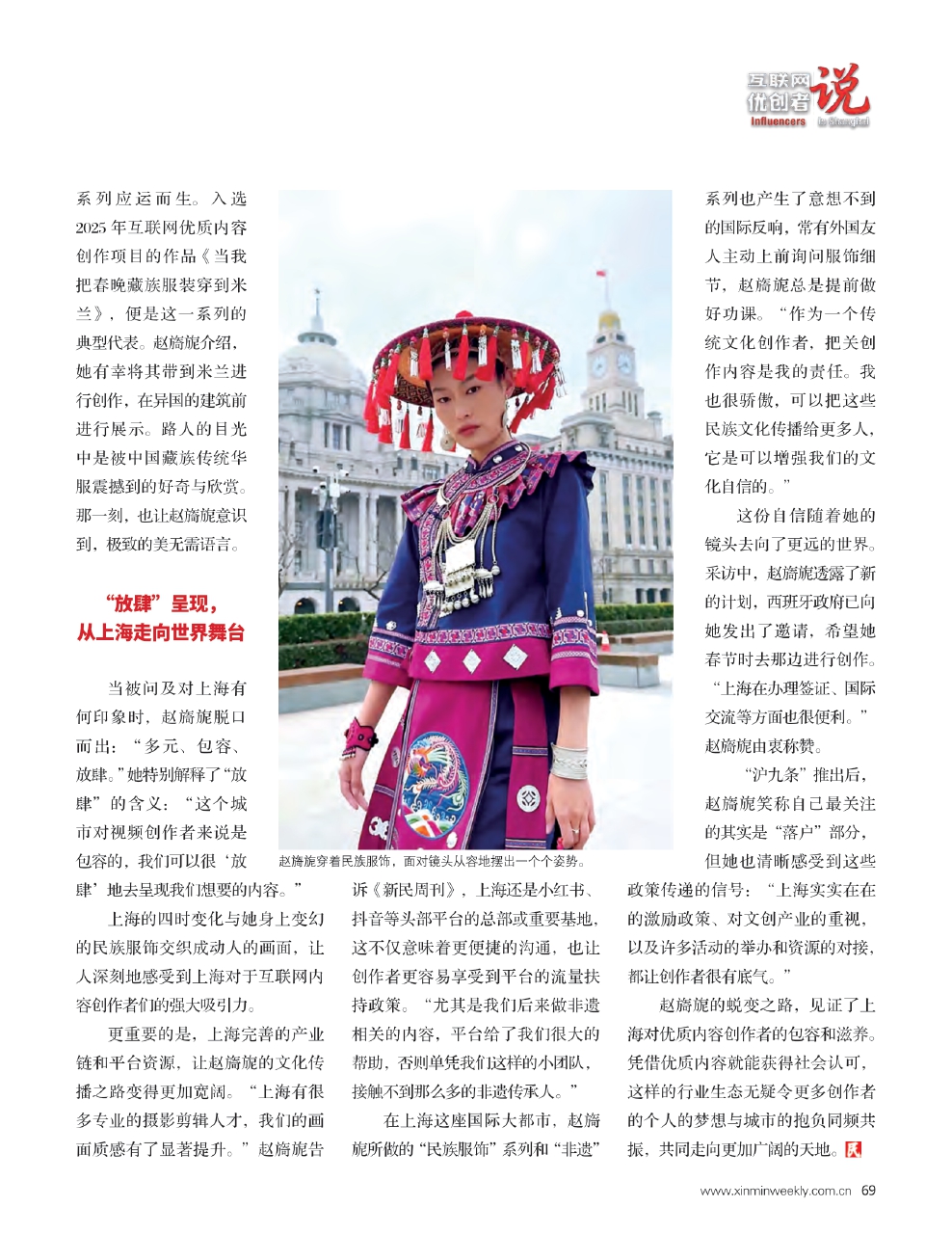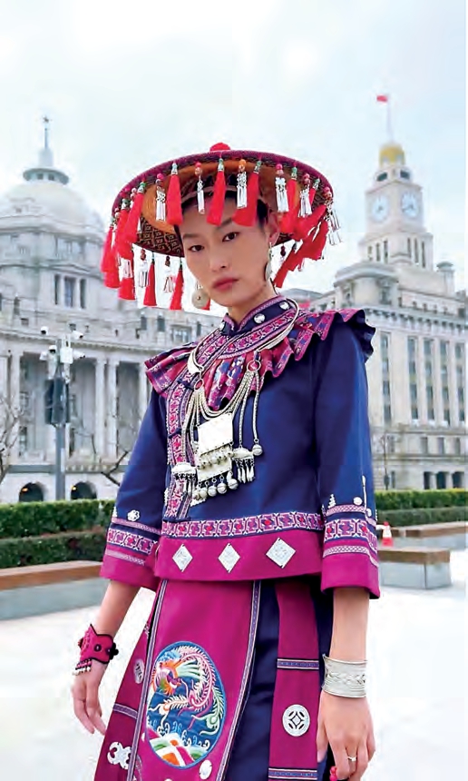 在上海这座国际大都市,赵旖旎所做的“民族服饰”系列和“非遗”系列也产生了意想不到的国际反响,常有外国友人主动上前询问服饰细节,赵旖旎总是提前做好功课。“作为一个传统文化创作者,把关创作内容是我的责任。我也很骄傲,可以把这些民族文化传播给更多人,它是可以增强我们的文化自信的。”
