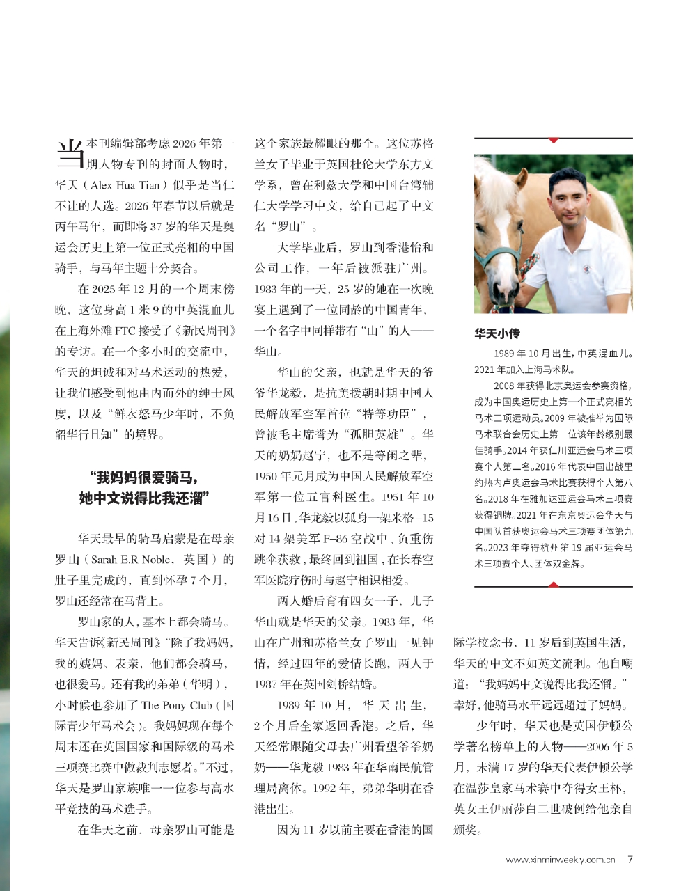 当本刊编辑部考虑2026年第一期人物专刊的封面人物时,华天(Alex Hua Tian)似乎是当仁不让的人选。2026年春节以后就是丙午马年,而即将37岁的华天是奥运会历史上第一位正式亮相的中国骑手,与马年主题十分契合。