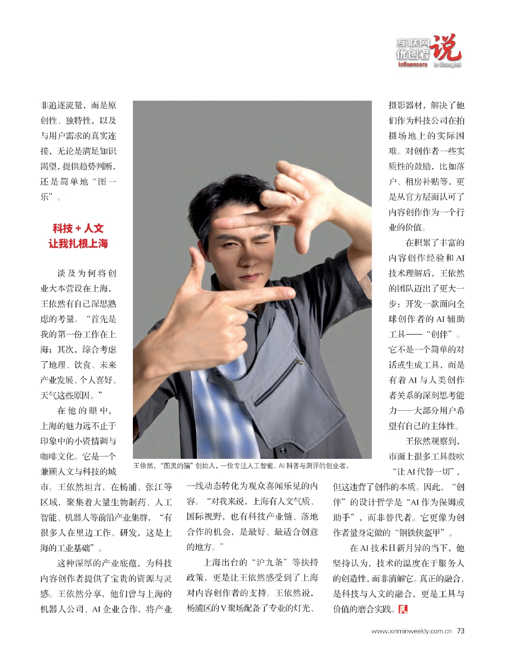 王依然在接受采访时告诉《新民周刊》,上海是一座互联网内容创作“好莱坞”,令他沉浸其中。他的故事,是一部个人与时代、科技与人文、理想与城市相互交织的叙事,而上海,正是这部叙事中不可或缺的舞台。