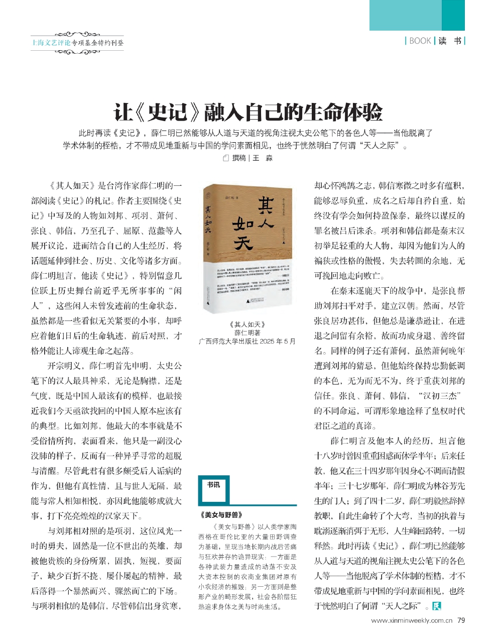 此时再读《史记》,薛仁明已然能够从人道与天道的视角注视太史公笔下的各色人等——当他脱离了学术体制的桎梏,才不带成见地重新与中国的学问素面相见,也终于恍然明白了何谓“天人之际”。