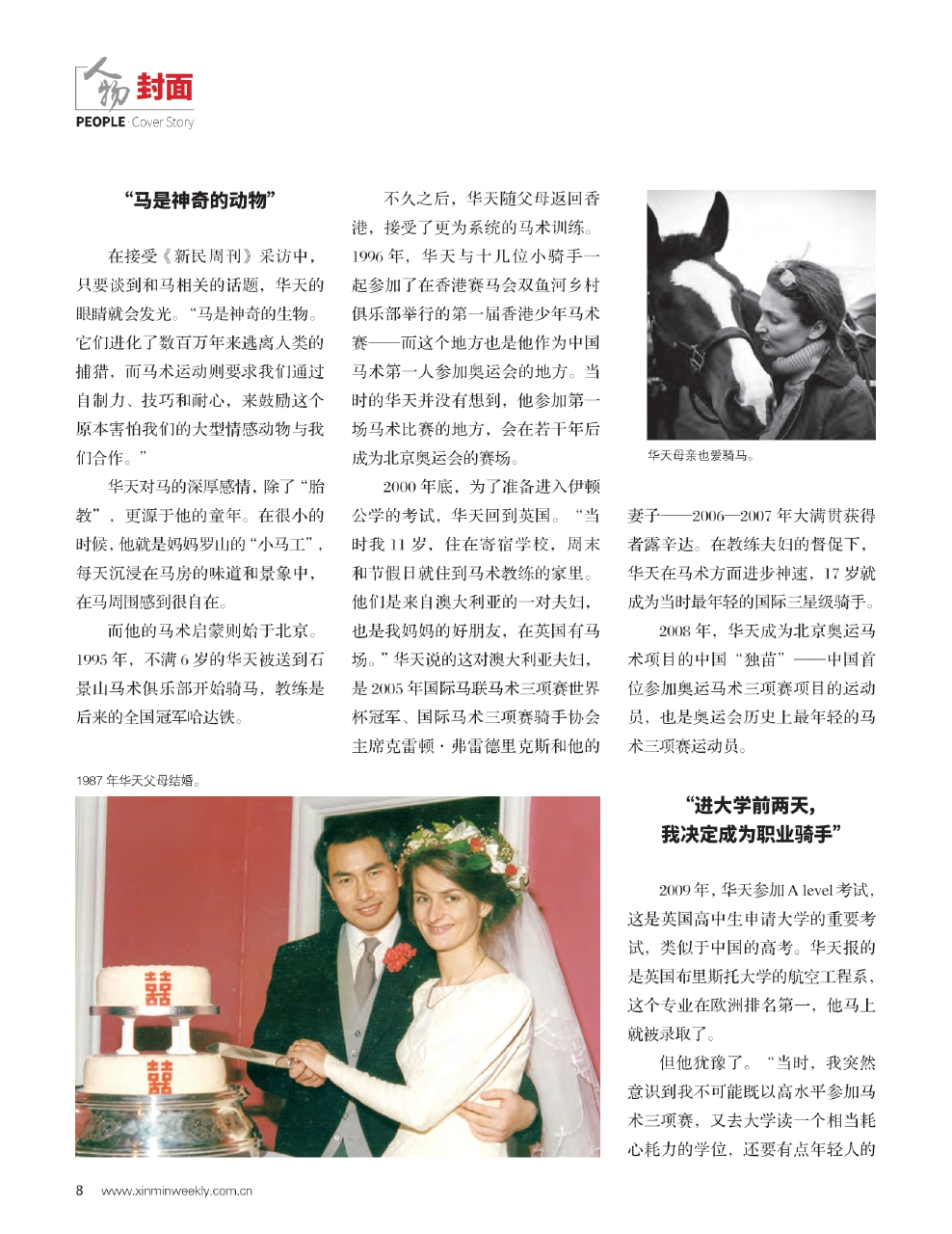 因为11岁以前主要在香港的国际学校念书,11岁后到英国生活,华天的中文不如英文流利。他自嘲道:“我妈妈中文说得比我还溜。”幸好,他骑马水平远远超过了妈妈。