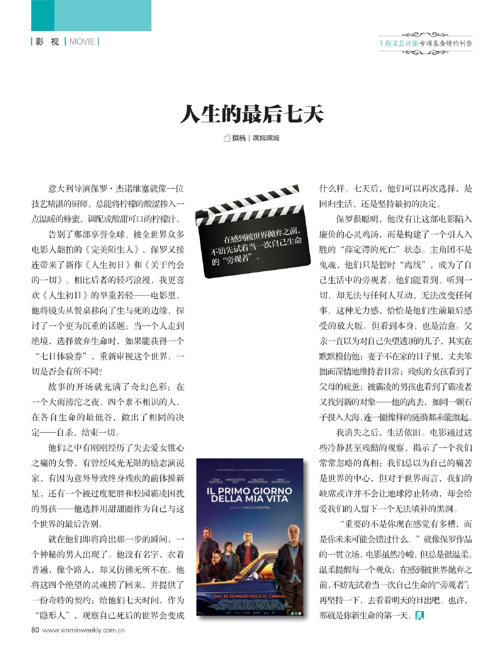 告别了那部享誉全球、被全世界众多电影人翻拍的《完美陌生人》,保罗又接连带来了新作《人生初日》和《关于约会的一切》。相比后者的轻巧浪漫,我更喜欢《人生初日》的举重若轻——电影里,他将镜头从餐桌移向了生与死的边缘,探讨了一个更为沉重的话题:当一个人走到绝境,选择放弃生命时,如果能获得一个“七日体验券”,重新审视这个世界,一切是否会有所不同?