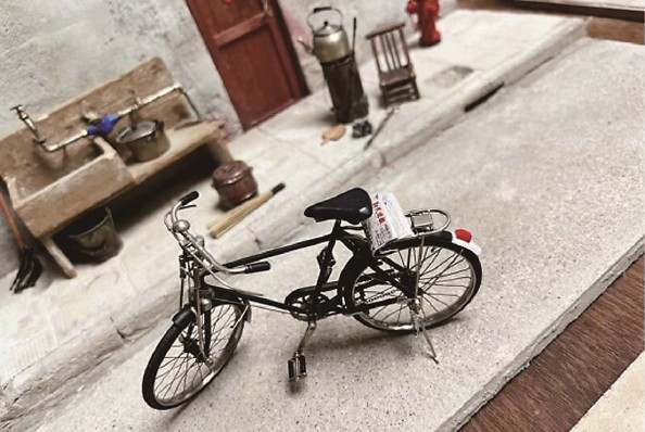 在吴淞街道文化活动中心二楼的一间工作室里,海派微缩技艺非遗传承人赵培艺正俯身雕刻着一个微缩木凳。走进这里,仿佛踏入了一个“迷你世界”:能点燃的小煤球炉、抽屉可开合的老橱柜、后座夹着《新民晚报》报纸的自行车……每一件作品都细节满满,透着浓浓的生活气息。