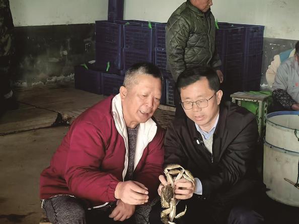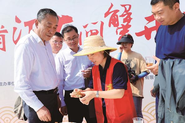 顾怡(中)在开捕节上,向来宾介绍大泖牌黄浦江大闸蟹