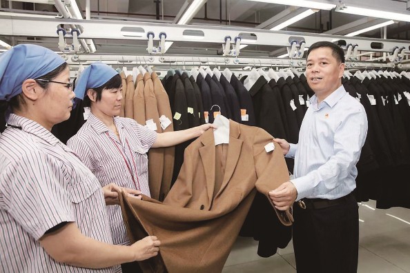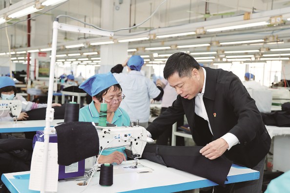 图为李长虹正在确认出厂衣服品质