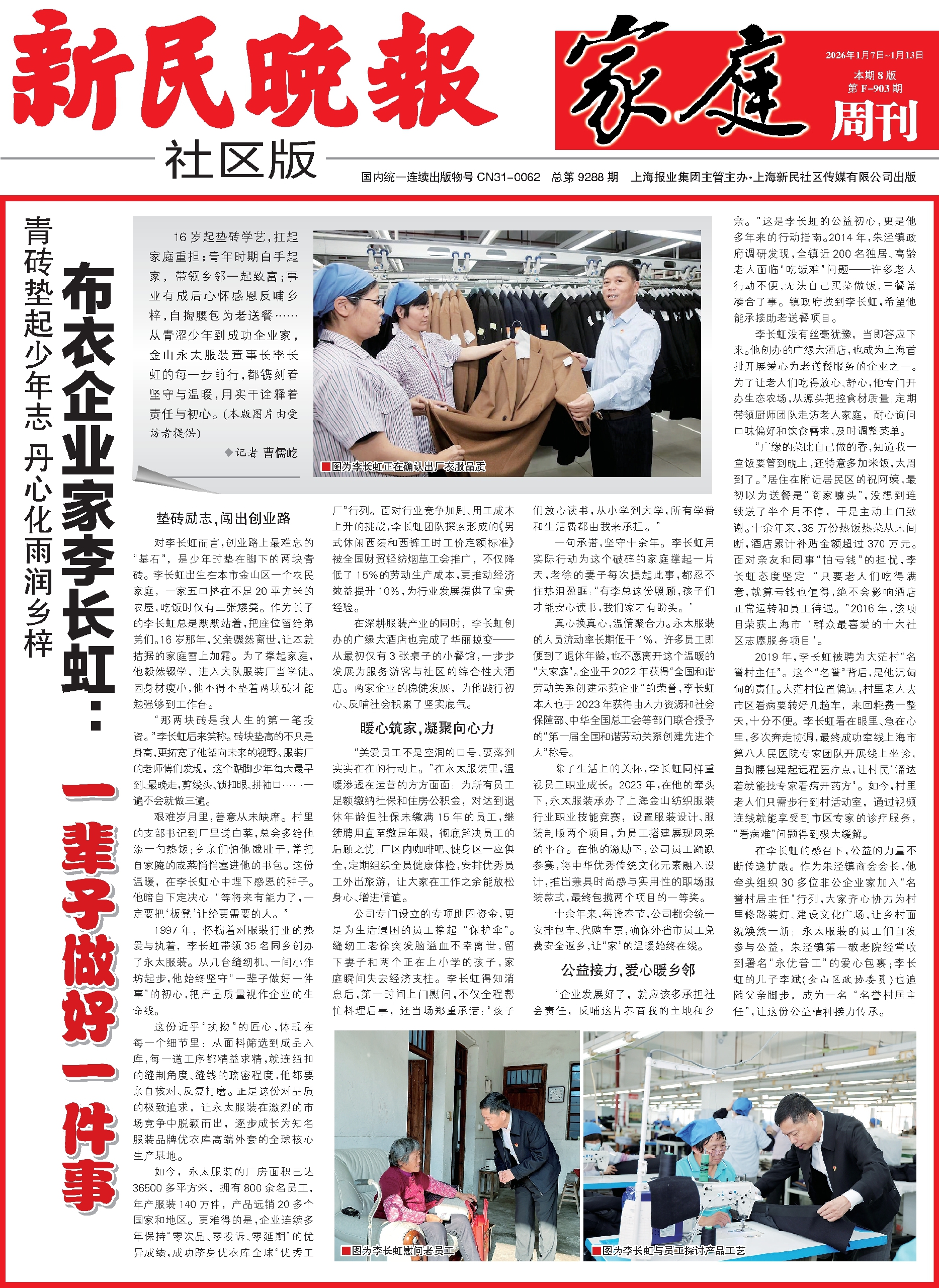 16岁起垫砖学艺,扛起家庭重担;青年时期白手起家,带领乡邻一起致富;事业有成后心怀感恩反哺乡梓,自掏腰包为老送餐……从青涩少年到成功企业家,金山永太服装董事长李长虹的每一步前行,都镌刻着坚守与温暖,用实干诠释着责任与初心。(本版图片由受访者提供)