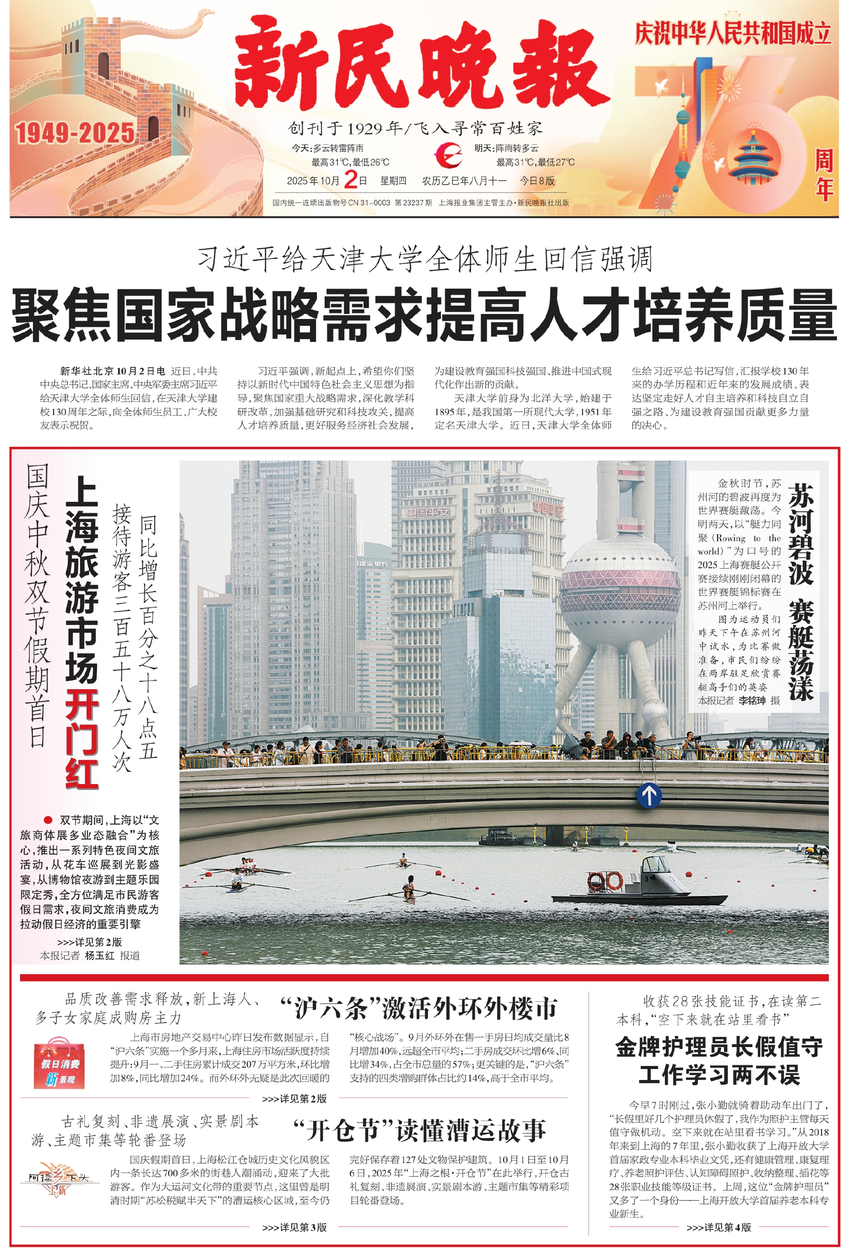 金牌护理员长假值守 工作学习两不误 “沪六条”激活外环外楼市 “开仓节”读懂漕运故事 上海旅游市场开门红 聚焦国家战略需求提高人才培养质量 苏河碧波  赛艇荡漾