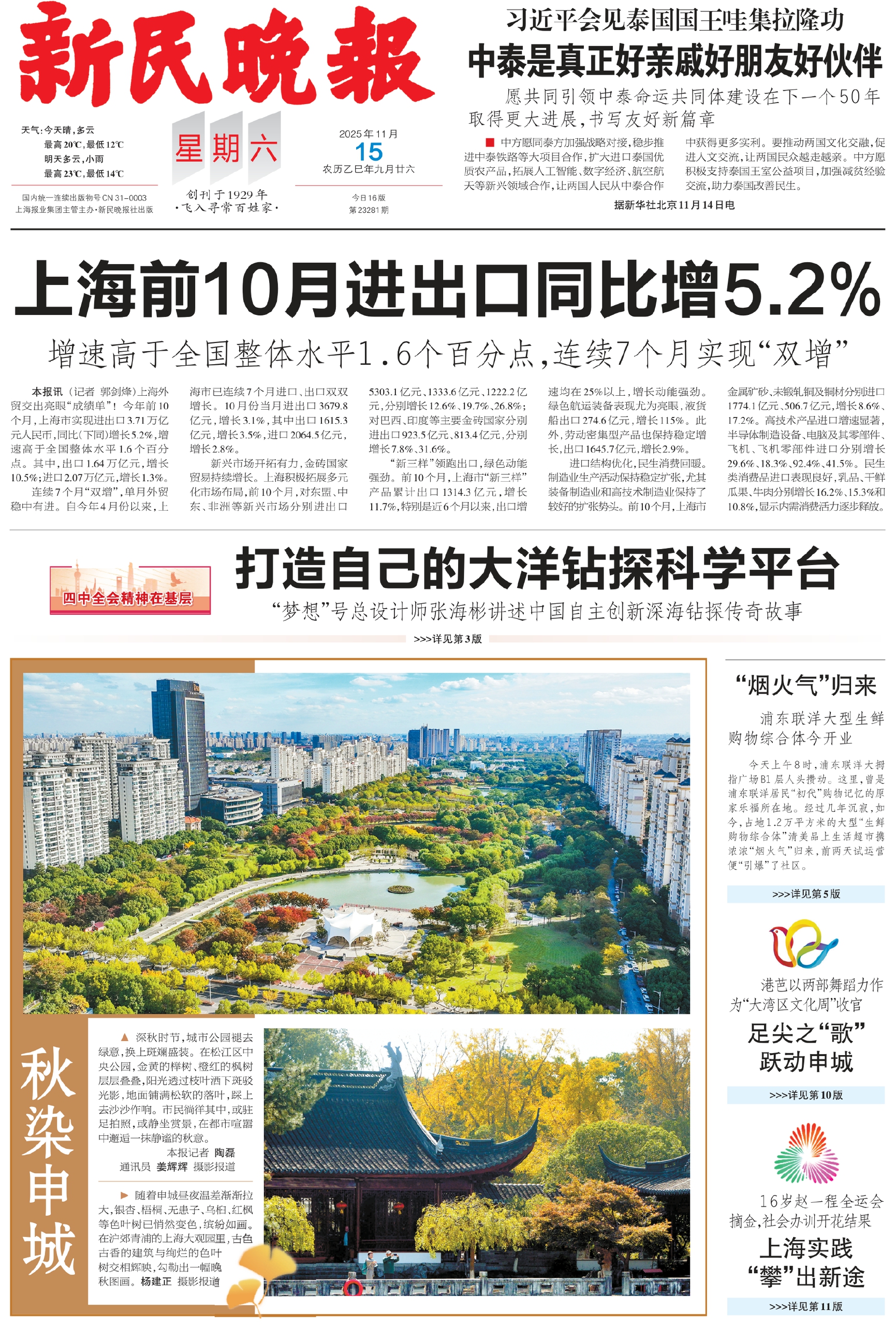 ■ 中方愿同泰方加强战略对接,稳步推进中泰铁路等大项目合作,扩大进口泰国优质农产品,拓展人工智能、数字经济、航空航天等新兴领域合作,让两国人民从中泰合作中获得更多实利。要推动两国文化交融,促进人文交流,让两国民众越走越亲。中方愿积极支持泰国王室公益项目,加强减贫经验交流,助力泰国改善民生。 据新华社北京11月14日电